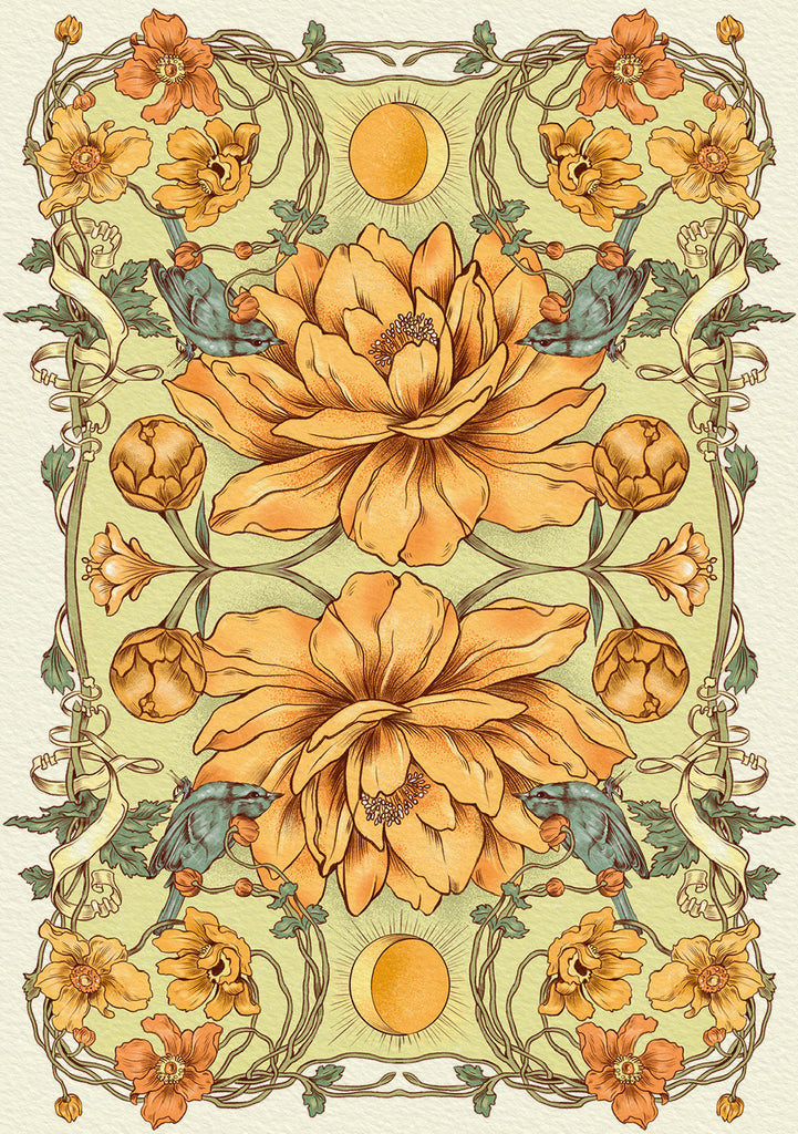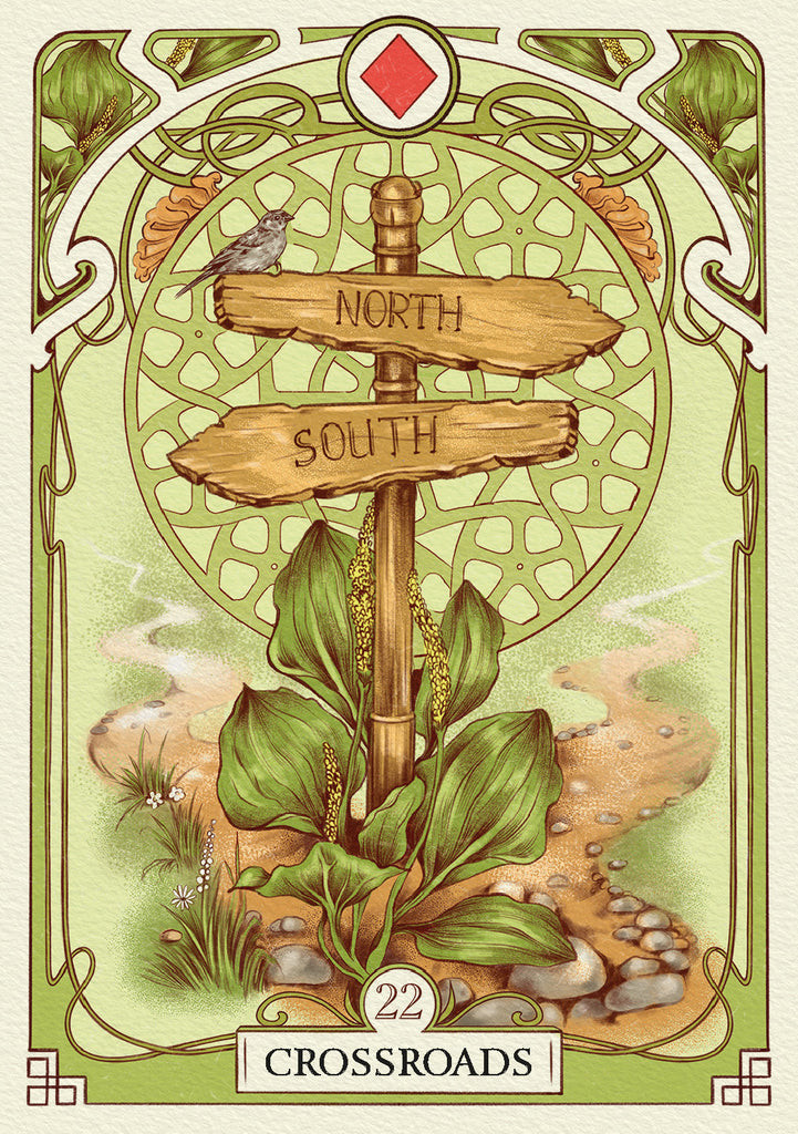 Ta artystyczna wersja słynnej francuskiej talii prezentuje świeże, kreatywne podejście do formatu, wykorzystując zapierające dech w piersiach wizualizacje i organiczne kształty ruchu Liberty, aby oprawić wszystkie elementy klasycznych kart Lenormand w najmodniejszy możliwy sposób. Każda karta ma swoją własną, specyficzną ramkę z kwiatowymi odniesieniami, które wprowadzą treść i smak do odczytów. W dziełach sztuki zawarte są symbole francuskich kart odpowiadające każdemu z tradycyjnych archetypów Lenormand.