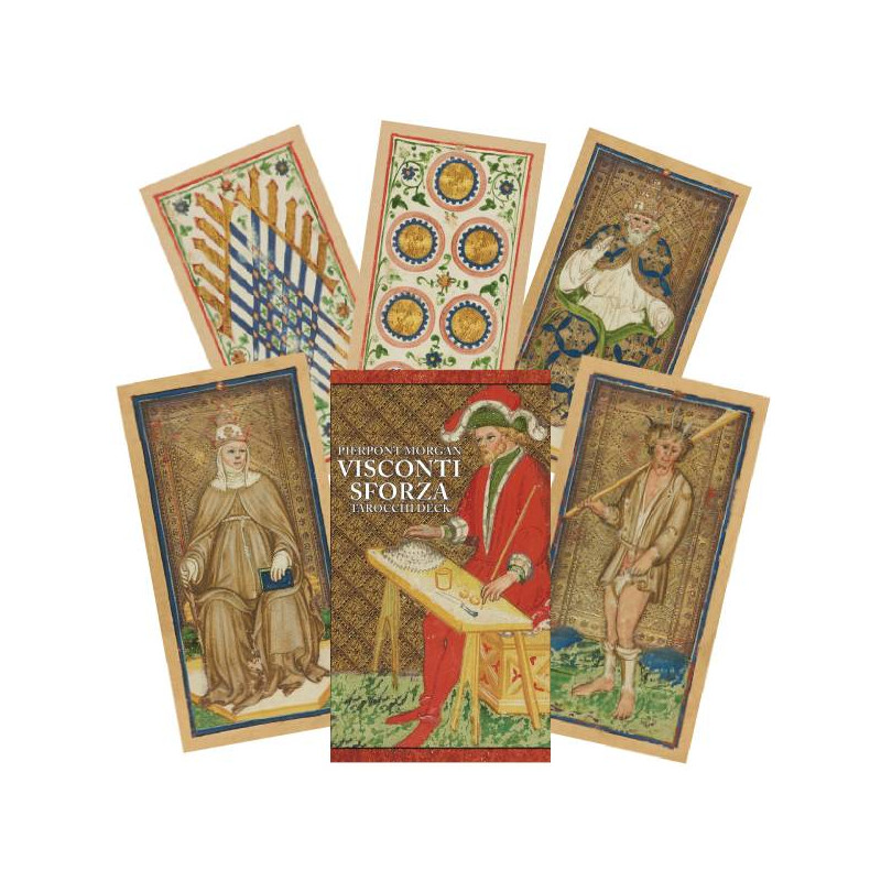 60-stronicowy przewodnik autorstwa Stuarta R. Kaplana zawiera kolorowe ilustracje kart tarocchi. Pakiet zawiera dwie dodatkowe karty z portretami Bianki Marii Visconti i Francesco Sforzy. Talia 78 kart składa się z pełnokolorowych, faksymilowych reprodukcji 74 zachowanych, oryginalnych kart tarocchi Visconti-Sforza, które przetrwały z XV wieku (Mediolan, Włochy). Cztery karty zostały skrupulatnie odtworzone, aby zastąpić te brakujące w oryginalnej talii: Diabeł, Wieża, Trójka Mieczy i Rycerz Monet. Karty, które nie mają tytułów ani numeracji, przedstawiają codzienne życie w średniowiecznym Mediolanie poprzez alegoryczne obrazy.