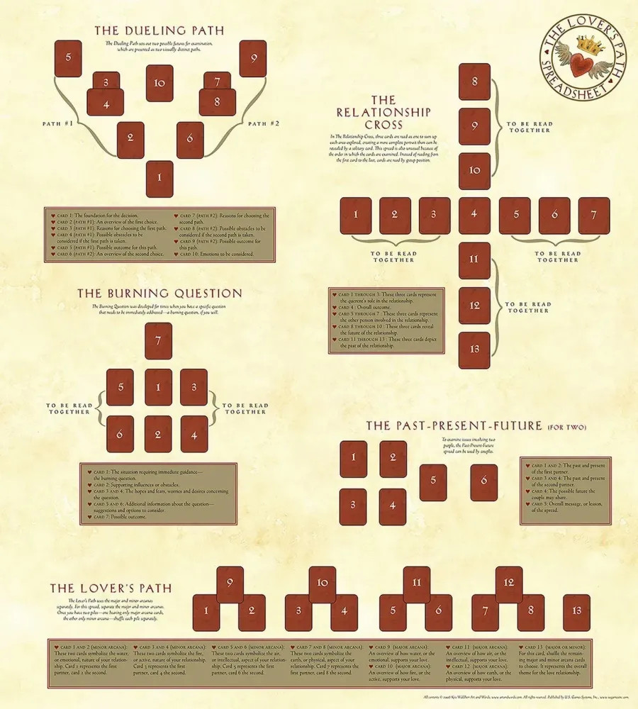 Ta talia kart tarota koncentruje się na tematyce miłości, co sprawia, że jest doskonałym narzędziem do badania kwestii serca i relacji. Każda karta jest nasycona symboliką związaną z miłością i połączeniem.