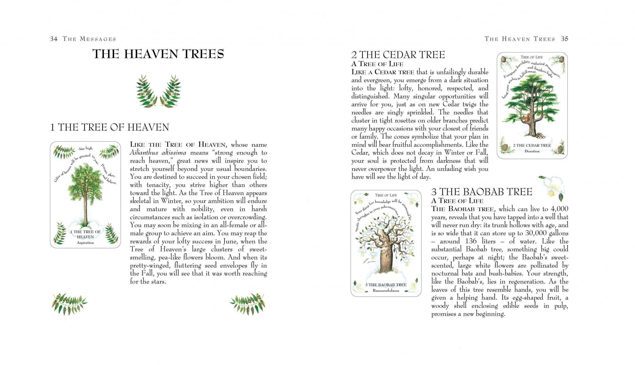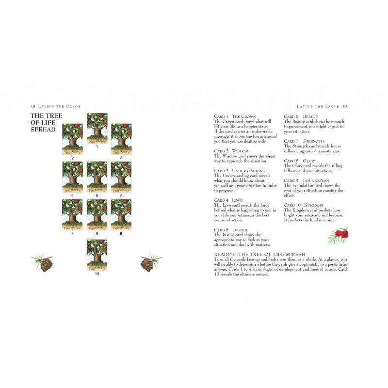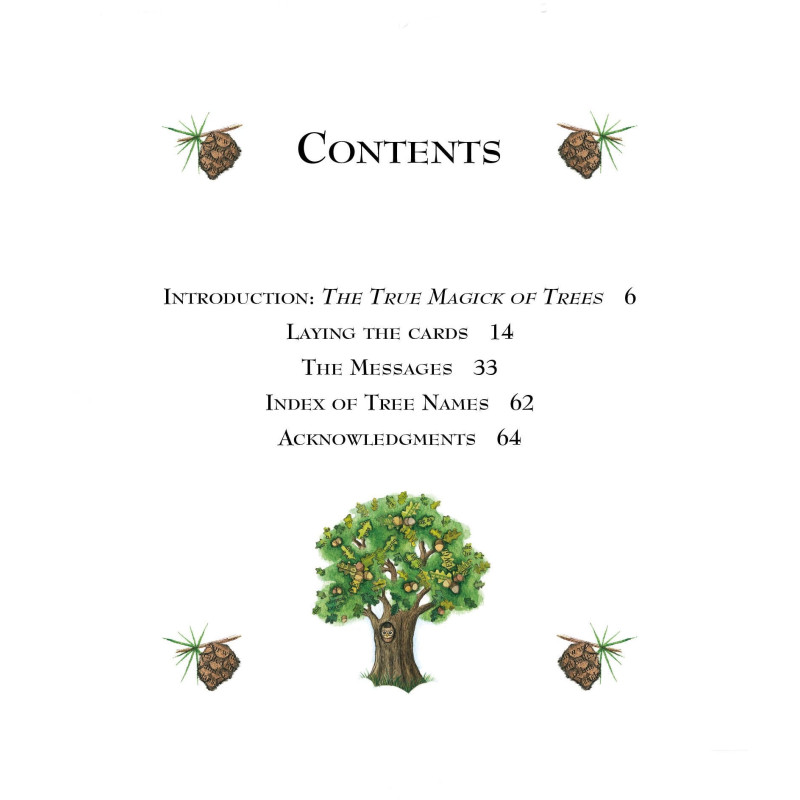 W folklorze drzewa są domami nadprzyrodzonych duchów, nimf i bóstw żywiołów. W tradycji mistycznej "drzewo życia" posiada klucz do tajemnic całego nieba i ziemi. The Tree Magick Oracle przedstawia 52 czarujące przesłania drzew, które można wybierać każdego dnia w poszukiwaniu inspiracji i wskazówek. Przesłania są podzielone na dwa zestawy, aby odzwierciedlić światło i cień lasu. Drzewa w kolorze ziemi, zakorzenione w praktyczności, ostrzegają przed zamieszaniem lub uwikłaniem. Drzewa w kolorze nieba, których gałęzie sięgają nieba, niosą przesłanie nadziei i duchowości. Podobnie jak w życiu, przesłania drzew odzwierciedlają wyzwania, przed którymi stoimy i oferują oświecenie w każdej sytuacji. Dołączona książka pokazuje, jak używać kart jako afirmacji i zawiera sześć układów do pracy z kartami do medytacji lub przewidywania przyszłości.